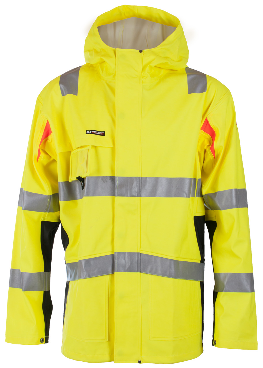 • Flammehemmende PU/PVC regnjakke med to frontlommer med klaff.