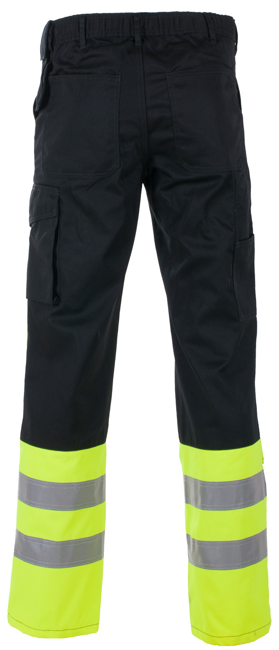 Bukse med knelommer, elastikk bak i linning, mobillomme, to stikklommer, baklommer, tommestokklomme og lårlomme. EN ISO 20471 KL1.