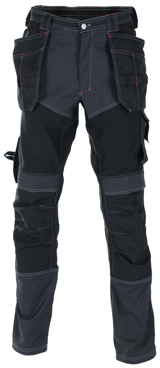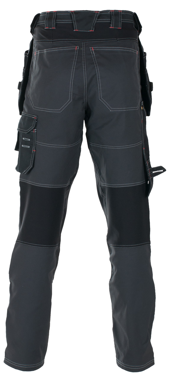 Håndverksbukse med paneler i 4-veis stretch som gjør buksa utrolig behagelig i bruk. Buksa har stikklommer i front, hengelommer, baklommer, dobbel tommestokklomme plassert over sidesøm på buksa. Lårlomme venstre side med mobillomme, knelommer og feste for hammerholder.
