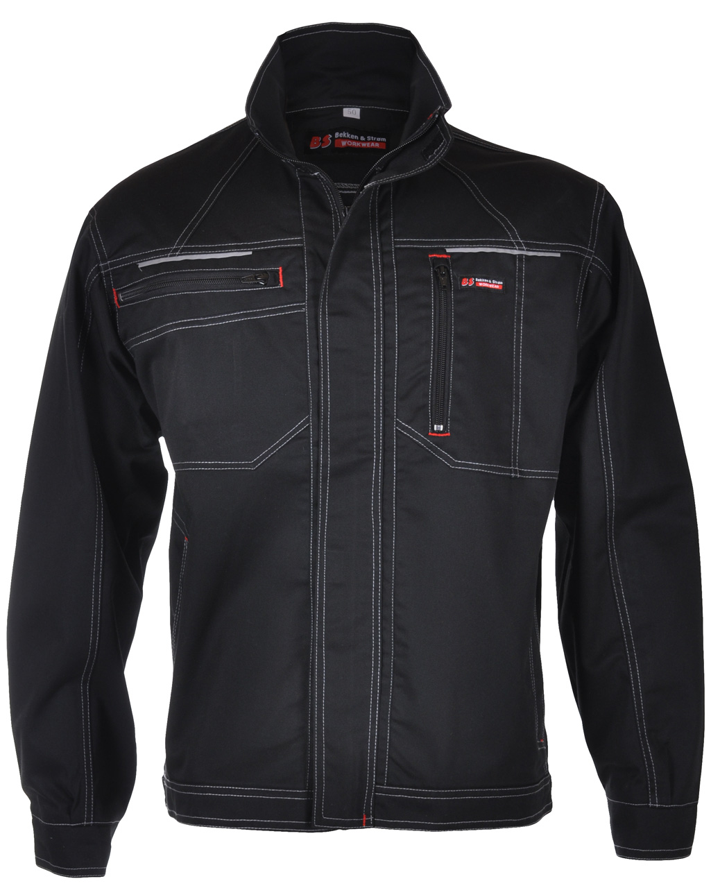 Håndverksjakke med to brystlommer og to stikklommer med glidelås. Glidelås med klaff i front.