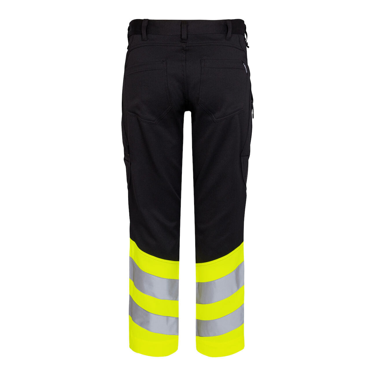 Elastiske og funksjonelle fluorescerende bukser med moderne snitt. Optimal passform med bl.a. ergonomisk formet kneparti. Det elastiske stoffet gjør at bevegelighet og komfort er på topp. Knapper for lett og rask montering av hengelommer. D-ring foran til feste av f.eks. ID-kort. To romslige skrålommer foran. To baklommer. To lårlommer som lukkes med glidelås. På venstre side har lårlommen en ekstra telefonlomme. På høyre side har lårlommen påmontert meterstokklomme med ekstra inndelinger og en knivlomme som begge har en forsterkning. Kneforsterkning/knelomme med borrelåslukking nederst og laget i ekstra slitsterkt CORDURA®-materiale. Reflekser rundt leggen. Buksene har en ekstra bred oppbrett som er beregnet for å kunne øke lengden på buksene hvis det er behov for ekstra benlengde. En enkelt søm sprettes opp, så får buksen ekstra benlengde – uten å måtte sys på nytt. Bekledningsklasse 1. Testet etter 50 ganger vask.