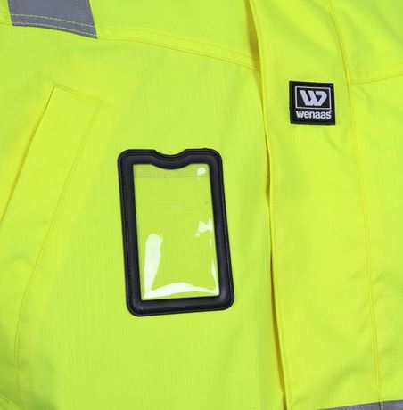 Ekstra refleks over skuldre. Skjult glidelås med Krage med fleece på innsiden, skjult avtakbar hette med stramming tilpasset hjelm, skjult glidelås under frontklaff. 2 brystlommer og 2 fremlommer med klaff. 1 ID-kortlomme, 1 kartlomme med glidelås og mobillomme på innsiden. Vanntett ytterstoff, vattert for, ribbestrikket mansjett med tommelgrep og borrelåsjustering i erme, justering av livvidde, og refleks på torso erme og skulder. Maks logoflate: 20×25 cm.