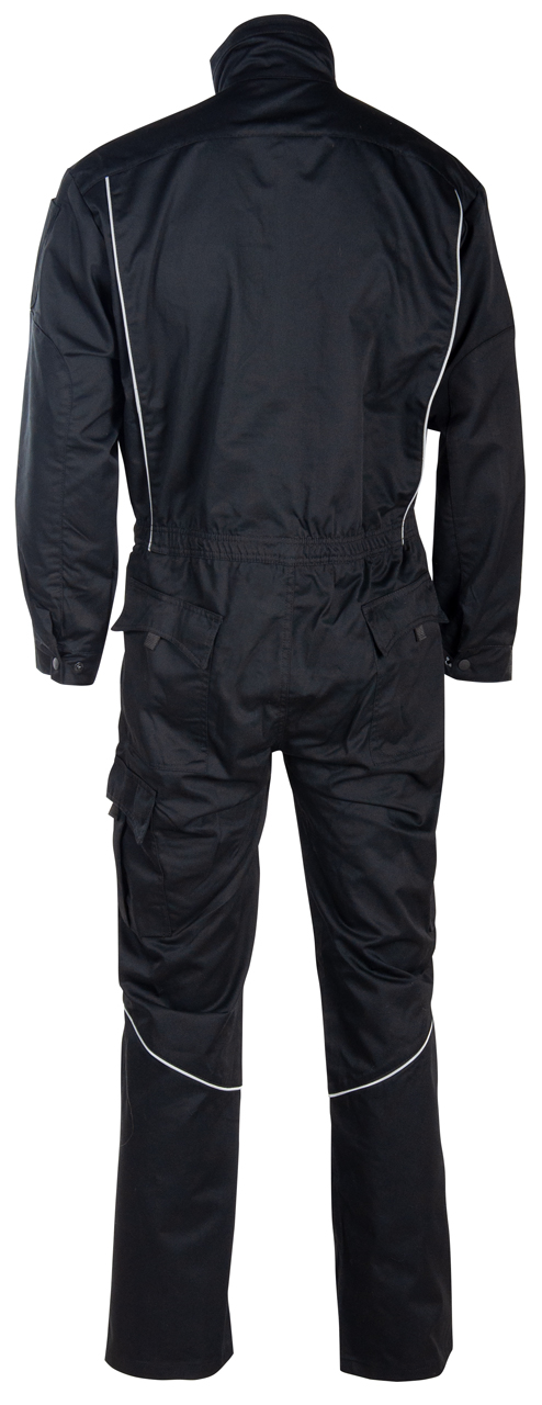 Kjeledress med strikk i liv, glidelås i front med klaff, gjennomgrep, stikklommer, tommestokklomme, brystlommer, to lårlommer og mobillomme.