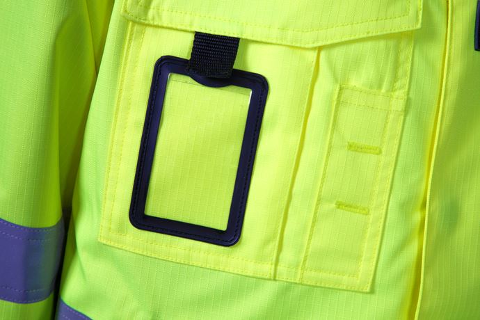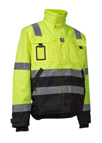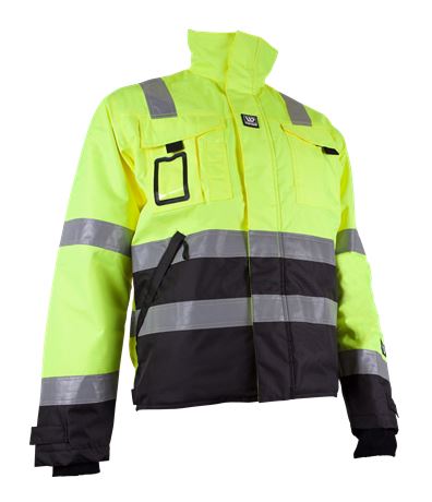 Krage med fleece på innsiden, skjult glidelås fra inn og utside under frontklaff, bærestykke foran og bak. Jakken har 2 brystlommer med klaff, 1 ID-kortlomme, 1 pennelomme, 2 framlommer med glidelås under klaff, 1 mobillomme med klaff. Vanntett ytterstoff, vattert for, ribbestrikket mansjett med tommelgrep, borrelåsjustering i erme og bak på linning, refleks på torso erme og skulder. Maks logoflate: 20×25 cm